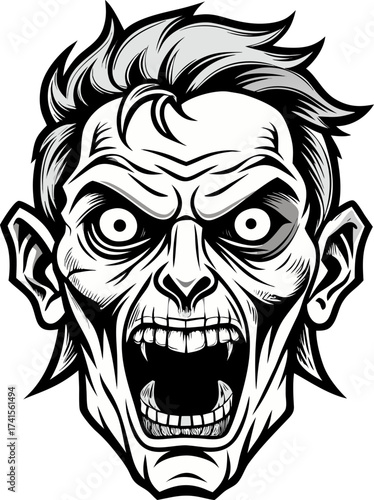 © Rasel, Fototapeta premium Zombie face, vector line art icon, black and white, white background