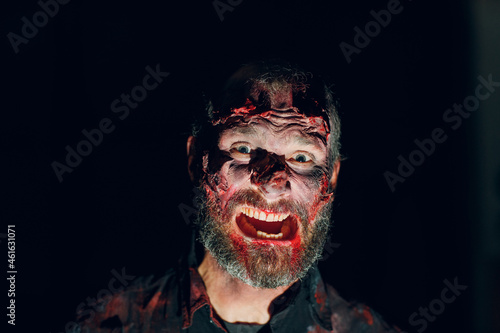 © primipil, Fototapeta premium Zombie man portrait in darkness with makeup for halloween party