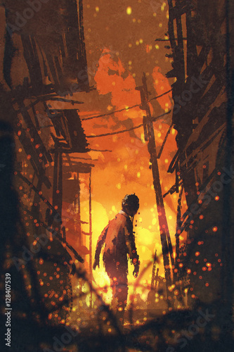 © grandfailure, Fototapeta premium zombie patrząc wstecz z płonącym tłem miasta, malowanie ilustracji