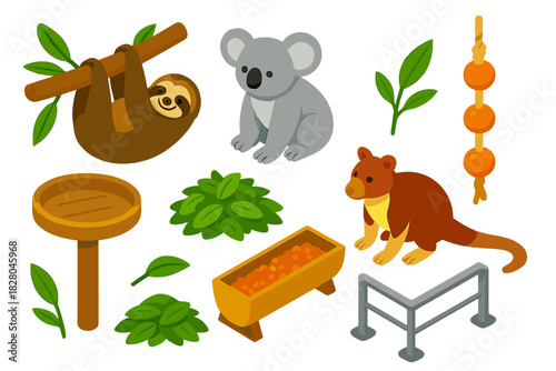 © Vector, Fototapeta premium Zoo Animal Icons. Isometric vector illustration set Zoo animals – sloth, koala, tree kangaroo; eucalyptus branch, nesting platform