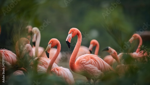 © VirtualVista, Obraz premium Zoo flamingos in vibrant pink hues among a blurred green background, showcasing themes of migration