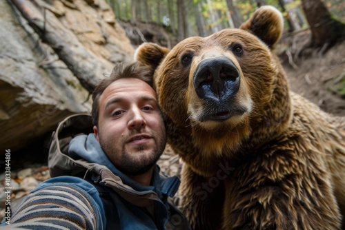 © nsit0108, Naklejka premium Zoologist taking a selfie with a brown bear in the forest