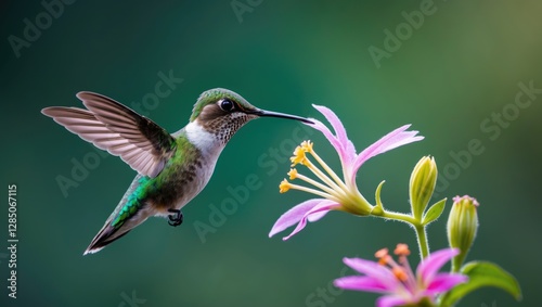 Naklejka premium Zoomed-in image of an Anna's Hummingbird sipping nectar from a flower against a soft green backdrop.