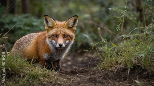 Fototapeta premium "Zorro de pie en un sendero de tierra rodeado de vegetación verde, capturando...