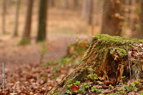 © Andreas, Fototapeta premium ztree stump amidst leaves in front of a forest trail