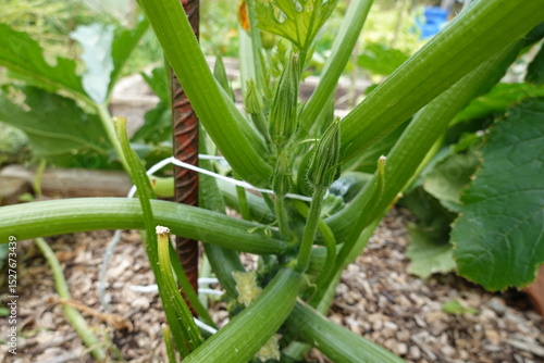 © tonifrito, Obraz premium Zucchini plant growing on a stake in vegetable garden