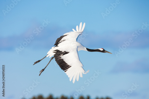 © A. Zeitler, Fototapeta premium Żuraw mandżurski tańczy na śniegu i leci w Kushiro na wyspie Hokkaido w Japonii w sezonie zimowym