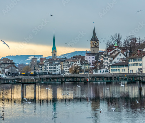 Obraz premium Zurich, a leading global city and among the world's largest financial centres despite having a relatively small population and while keeping a quaint, idyllic village-like atmosphere. Switzerland.