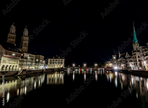 Fototapeta premium Zurich Night Scene of the Limmat River with light reflections and flares