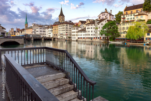© pillerss, Naklejka premium Zurich. Old city embankment and medieval houses at dawn.
