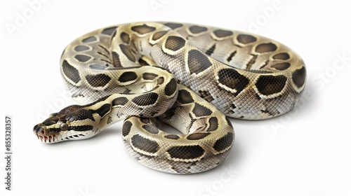 © Thanakrit, Fototapeta premium Zuwadi Ball Python A rare Zuwadi Ball Python with unique, intricate patterns, resting on an isolated white background for World Snake Day