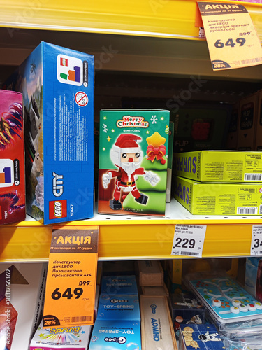 © Tanya, Naklejka premium Zvyagel, Ukraine - December 02, 2025: LEGO Christmas-themed building set featuring a Santa Claus figure on store shelf, showcasing festive toys and holiday spirit in vibrant packaging
