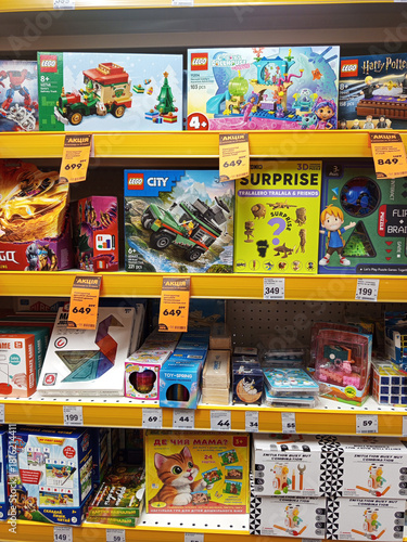 © Tanya, Naklejka premium Zvyagel, Ukraine - November 20, 2025: Colorful display of various LEGO sets on store shelves, featuring popular themes like Harry Potter and city adventures, showcasing creativity and playfulness