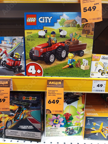 © Tanya, Naklejka premium Zvyagel, Ukraine - November 20, 2025: LEGO City tractor set displayed on store shelf, featuring farmer minifigure and accessories, ideal for creative play and imaginative storytelling