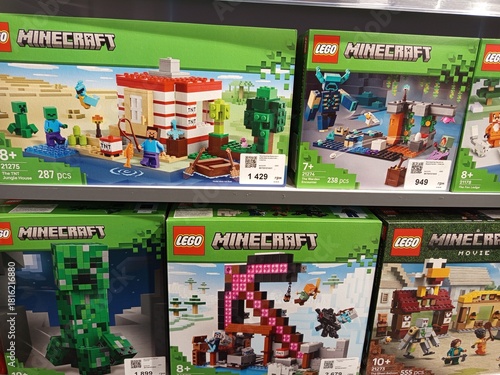 © Tanya, Obraz premium Zvyagel, Ukraine - November 20, 2025: LEGO Minecraft building sets displayed on store shelf, featuring various themes and characters, ideal for creative play and imaginative storytelling