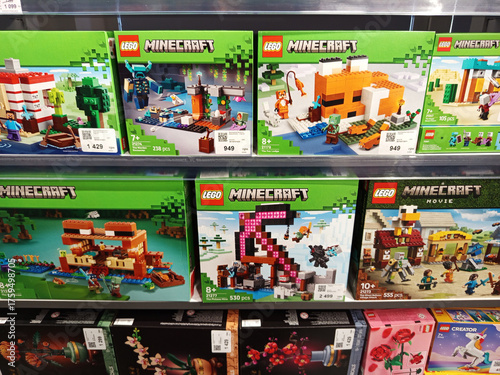 © Tanya, Naklejka premium Zvyagel, Ukraine - October 15, 2025: LEGO Minecraft building sets displayed on store shelf, showcasing various themes and characters, perfect for creative play and imaginative adventures