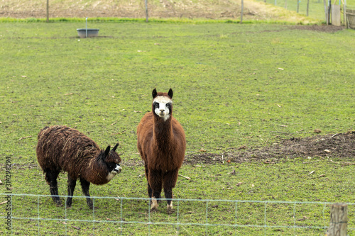 Fototapeta premium Zwei Alpaka Tiere auf einer Weide