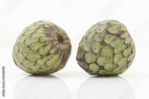 © tunedin, Fototapeta premium Zwei Cherimoya auf weißem Hintergrund