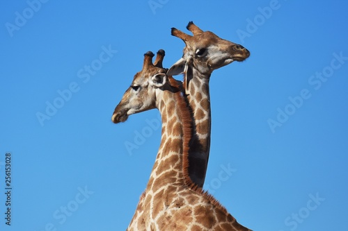 © anni94, Fototapeta premium Zwei Giraffenbullen (giraffa camelopardalis) kämpfen im Kgalagadi Nationalpark in Südafrika