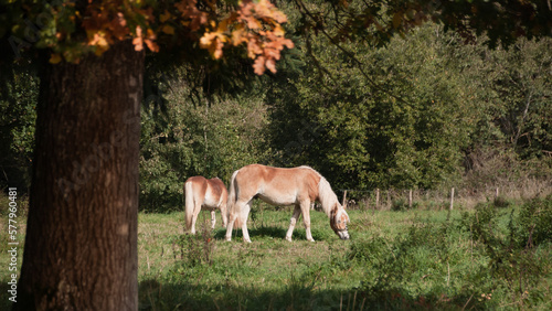 © Saahaas, Fototapeta premium Zwei Haflinger Fohlen steht im Gras auf der Weide im herbstlichen Sonnenschein