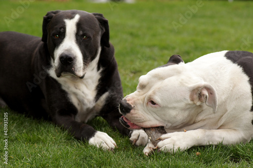 © zeralein, Fototapeta premium Zwei Hunde auf der Wiese beim Holz kauen