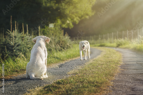 © manushot, Naklejka premium zwei labrador retriever hunde auf einer straßeim sommer