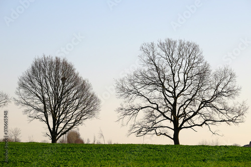© Erik, Obraz premium Zwei laubfreie Bäume auf einem Feld im Gegenlicht