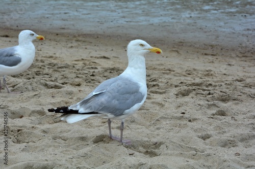 © Claudia Evans , Fototapeta premium Zwei Möwen stehen bei Ebbe am Sandstrand
