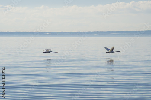 Obraz premium Zwei Schwäne fliegen über Wasser