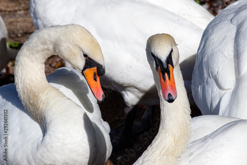 Obraz premium Zwei Schwäne, zueinander gebeugt, in einer Gruppe