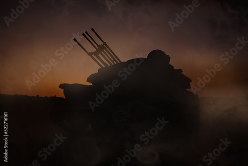 Fototapeta premium Silhouette of armored fighting vehicle on battlefield in night