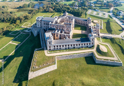Naklejka premium Stary, zrujnowany zamek Krzyżtopór w Ujeździe, Polska, zbudowany w XVII wieku, zrujnowany do nagich murów w XVIII wieku. Widok z lotu ptaka rano