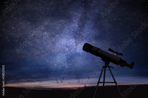 © vchalup, Fototapeta premium Sylwetka teleskop i rozgwieżdżone niebo w tle. Astronomia i gwiazdy obserwujące koncepcję.