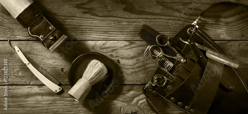 © vallerato, Obraz premium Vintage zestaw fryzjera. Tonowanie sepii
