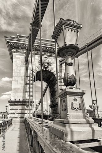 © mikeng, Naklejka premium Widok monochromatyczny dnia Mostu Łańcuchowego w Budapeszcie