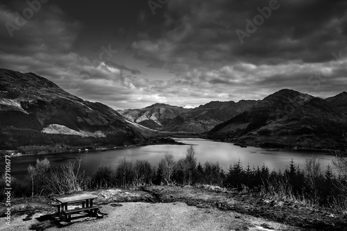 Naklejka premium Widok Ratagan Pass ze stołem piknikowym w czerni i bieli
