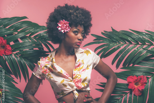 Obraz premium Zmysłowa afroamerykańska szpilka między liśćmi palmowymi. Przeciw Pink B